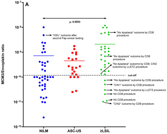 In Figure 2A, the boxplot showed the distribution of the ratio values of MCM3 and EVPL proteins among Hr-HPV positive individuals, which were grouped based on NILM, ASC-US, or ≥LSIL smear reports. Since undetermined significance is an unspecified condition, we separated the patient group with ASC-US score as a third group in the middle of the control and case groups [44,45]. Altogether, the uncertainty in sample classification is based on the current techniques used. As an example of the inherent uncertainty of the Pap-smear test, a Pap-smear-tested patient received a NILM cytology outcome during the initial gynecology visit. However, the result of a new Pap-smear test four months later was a reason to change this cytology outcome to HSIL (Figure 2A on the left, with a high-level MCM3 originally in agreement with HSIL).