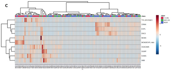 To further evaluate the relationship of the dependent variables measured in PRM data, we plotted an unsupervised hierarchical cluster heatmap from the same perspective (Figure 2C). This heatmap, based on a dataset including samples from NILM, ASC-US, and ≥LSIL groups, displays two main clusters: cancer markers (MCM3, CEACAM5, S100P, ICAM1) on the left and healthy markers (CRNN, EVPL, DSC2) on the right side of the figure. Samples in the ≥LSIL group predominantly cluster in the left part of the figure, whereas the NILM samples mainly cluster on the right side. No correlation between the total protein and HBB concentration with MCM3 and the MCM/EVP ratio suggests that high MCM3 and MCM3/EVPL is not due to the influence of blood contamination or high protein levels. The abundance levels of proteins are indicated with red (high) and light blue (low, zero level).