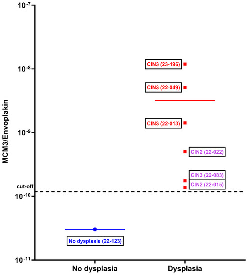 Nevertheless, successful discrimination can be seen in Figure 3; the non-dysplastic sample is located at the bottom of the graph with a lower value, while three CIN3 samples are located at the top of the graph, suggesting that the discrimination of dysplastic and non-dysplastic samples with the MCM3/EVPL ratio is in accordance with the gold-standard method LLETZ. Notably, the purple samples in the graph represent a different sample class consisting of three secondary LLETZ patients. These samples belong to ‘surgical follow-up cervix carcinoma patients’.