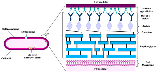 The cell wall of Mtb is the primary host–pathogen interaction spot, and is a major determinant of bacillus durability and robustness. The complex and dynamic structure of the cell wall (Figure 1) is essential for maintaining cellular integrity, enabling the adaptation of the bacilli to host conditions, and plays a crucial role in long-term infection and virulence. It comprises three essential substructures: a peptidoglycan (PG) inner layer, a mycolic acid (MA) outer layer, and an arabinogalactan polysaccharide (AGP) middle layer. The inhibition of key enzymes that are responsible for the biosynthesis of these substructures are excellent targets for novel drug development due to the absence of homologous characteristics in the host [37].