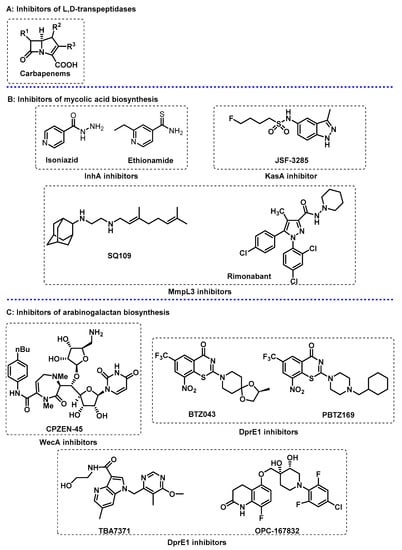 Selected compounds that target the cell envelope of Mycobacterium tuberculosis. (A) Carbapenems as inhibitors of L,D-transpeptidases; (B) inhibitors of the biosynthesis of mycolic acids; (C) inhibitors of the biosynthesis of arabinogalactan.