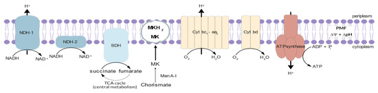 The Mtb ETC is a highly conserved collection of membrane-bound and membrane-associated enzymes and co-factors. It is comprised by five main primary dehydrogenases, which fuel the ETC as electron donors; two main terminal oxidoreductases, which catalyse the transfer of electrons to terminal electron acceptor; and an ATPsynthase, which produces ATP through the dissipation of the PMF. A schematic representation of the Mtb ETC is presented in Figure 3 [59,60,61].