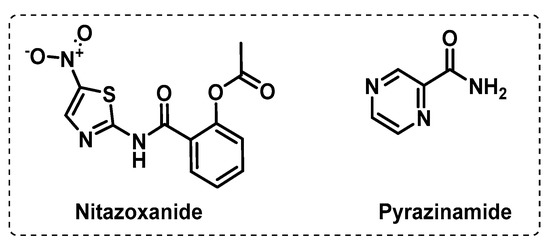 Nitazoxanide is an FDA-approved repurposed drug with broad-spectrum antiparasitic and antiviral activity. NTZ is proposed to promote Mtb killing by enhancing autophagy through the inhibition of human mTORC1 and disrupt the PMF by acting as a protonophore. NTZ potently inhibits both active and latent Mtb, bacilli but has poor pharmacokinetic and pharmacodynamic proprieties. Thus, there is some interest in the development of NTZ derivatives with improved bioavailability [59,79,80].