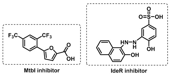 Another approach to block iron uptake in Mtb is to inhibit the iron-dependent transcription factor, IdeR, which controls siderophore synthesis. This regulator is a DNA-binding protein of the DtxR family that is responsible for the activation or deactivation of storage proteins, according to the excess or lack of iron, respectively. A screening against IdeR revealed benzothiazole benzene sulfonic (Figure 6) as a promising scaffold to develop IdeR inhibitors [6,84,85].