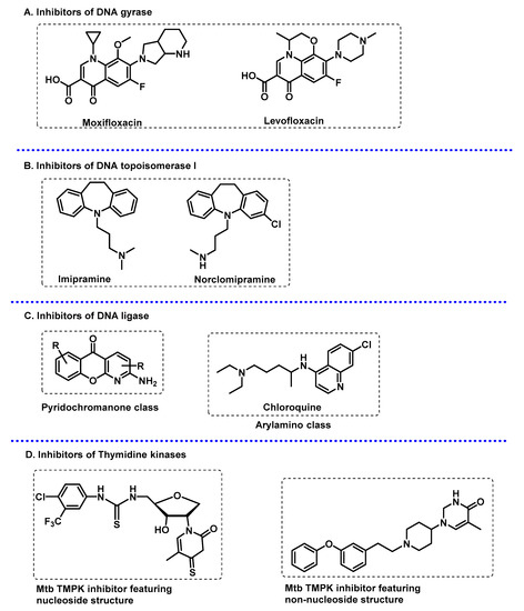 DNA-related enzymes: (A) second-line anti-TB fluoroquinolones as DNA gyrase inhibitors; (B) DNA topoisomerase I inhibitors of Mtb; (C) examples of inhibitors of Mtb DNA ligase; (D) thymidine monophosphate kinase inhibitors.