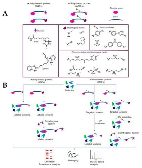 (A) Structure of activity-based probes and affinity-based probes. Overview of common structures used as reporters, bio-orthogonal handles, and photo-crosslinkers. (B) Workflow for protein profiling using activity-based probes and affinity-based probes.