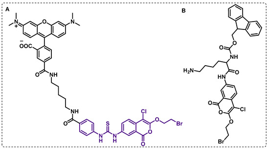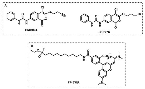 Lentz et al. designed activity-based probes (ABPs) to selectively target Mtb “Hydrolase important to pathogenesis” (Hip 1). This is a cell-envelope-associated serine protease whose proteolytic activity is required for the immunomodulation of host inflammatory responses and has weak homology to other host proteases. From a library of serine-reactive electrophiles, a series of 7-amino-4-chloro-3-(2-bromoethoxy)isocoumarins were identified as potent time-dependent inhibitors of Hip1, and were used to synthesise the fluorescence probe (Figure 10A). While this ABP displayed high potency but low selectivity, optimizing the isocoumarin scaffold led to the isocoumarin (Figure 10B), an inhibitor with nanomolar activity against Hip1 and improved selectivity [98].