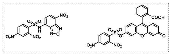 Sulfone fluorogenic probes: benzoxadiazole (left) and fluorescein (right).