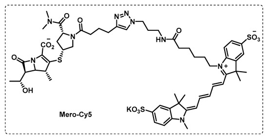Similar to other bacterial infections, penicillin and cephalosporin β-lactam antibiotics fail in TB therapeutics due to inactivation using β-lactamases. However, based on the observation that carbapenems can reduce the activity of this enzyme, Levine et al. developed activity-based probes based on a carbapenem derivative meropenem, Mero-Cy5 (Figure 15), with the aim of finding a class of enzymes and the mechanism of action of meropenem. This probe inhibited L,D-transpeptidases as it binds to an active-site cysteine residue, but also binds to other transpeptidases and carboxypeptidases, as well as to β-lactamase. The probe designed by Levine et al. proved to be a powerful tool for target identification and highlights the potential of carbapenem β-lactam antibiotics to treat TB [105].