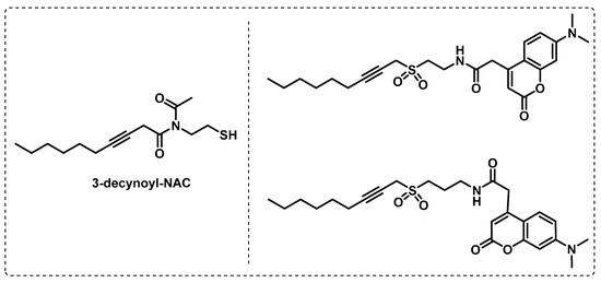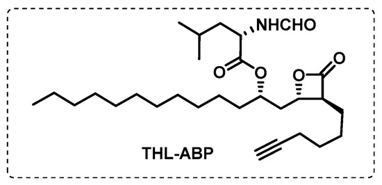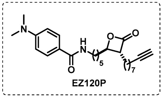 Serine hydrolases play a crucial role in catalysing essential transacylation reactions, namely in binding mycolates as β–keto or hydroxyesters. The similarity between the β-lactone pattern and mycolates enables the covalent acylation of catalytic serine residues with β-lactones. Based on this, Lehmann et al. developed β-lactones that could covalently inhibit these enzymes, preventing the formation of a mycobacterium membrane. A β-lactone developed by this group exhibited good activity and selectivity for mycobacteria and they synthesised an alkyne probe, EZ120P, to identify the molecular targets (Figure 16). Through standard ABPP procedures, the serine proteases Pks13 and Ag85, essential proteins in the biosynthesis of the mycobacterial cell wall, were identified as possible targets [106].