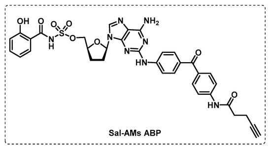 - Duckworth, B.P.; Wilson, D.J.; Nelson, K.M.; Boshoff, H.I.; Barry, C.E., III; Aldrich, C.C. Development of a Selective Activity-Based Probe for Adenylating Enzymes: Profiling MbtA Involved in Siderophore Biosynthesis from Mycobacterium tuberculosis. ACS Chem. Biol. 2012, 7, 1653–1658. [Google Scholar] [CrossRef]
