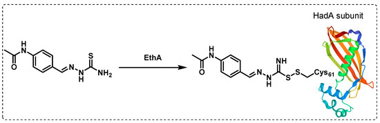 - Grzegorzewicz, A.E.; Eynard, N.; Quémard, A.; North, E.J.; Margolis, A.; Lindenberger, J.J.; Jones, V.; Korduláková, J.; Brennan, P.J.; Lee, R.E.; et al. Covalent Modification of the Mycobacterium tuberculosis FAS-II Dehydratase by Isoxyl and Thiacetazone. ACS Infect. Dis. 2015, 1, 91–97. [Google Scholar] [CrossRef]