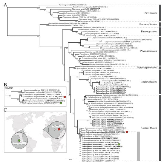 Isolation sites of two Ochrosphaera neapolitana strains and phylogenetic relationships inferred from 18S and 28S rRNA sequences. The 18S rRNA-based phylogeny of haptophytes. Red and green circles indicate newly isolated Ochrosphaera neapolitana strains, and bolds and asterisks indicate newly acquired partial 18S rRNA by PCR (bootstrap values < 50 were not presented) (A). Simplified 28S rRNA phylogeny from the original Supplementary Figure S1. Both the 18S and 28S rRNA trees show the sister-group relationship of the genera Hymenomonas and Ochrosphaera (B). Isolation sites for two Ochrosphaera neapolitana strains from Gran Canaria, Spain, (CCAC 3688 B, Red circle) and Treasure Island, Florida, USA (A15,280, Green circle) (C).