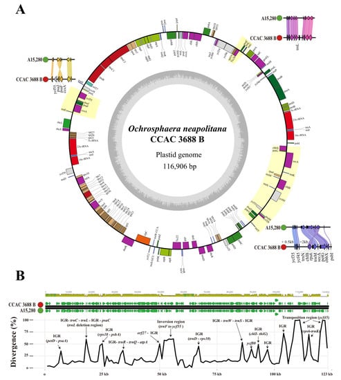 Comparison of the plastid genomes of O. neapolitana CCAC 3688 B and A15,280. Circular map of the plastid genomes of genomes of O. neapolitana CCAC 3688 B and A15,280 (A). Locations of additional genes and the translocation of gene synteny are illustrated beside the reference genome of CCAC 3688 B. Sequence divergence comparison between the two plastid genomes (B). Genes or (inter)genic regions (IGR) with high divergence rates are indicated with arrows.