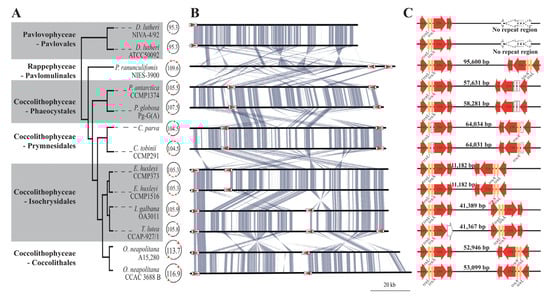 Although there was a conserved plastid genome structure within each order of haptophytes, low structural integrities were found between the orders, especially in the copy number of ribosomal repeats and their constituents (tRNAs and rRNAs) (Figure 4B,C). The Pavlovales had one copy of the ribosomal operon, which was formed by 16S rRNA-trnL-trnA-26S rRNA, but the other haptophyte taxa (i.e., Rappephyceae and Coccolithophyceae) had a pair of inverted repeats that created a quadripartite structure in the genome. Pavlomulina ranunculiformis (Pavlomulinales) contained symmetric repeats with two intact IRs. Within the Coccolithophyceae, two Phaeocystales species (Phaeocystis antarctica and P. globosa) contained asymmetric repeats, i.e., the IRa had an intact ribosomal repeat, but the IRb lacked two tRNAs []. In the case of Chrysochromulina tobinii and Chrysochromulina parva (Prymnesidales), the two ribosomal repeats had only one tRNA each (tmL in Ira and trnA in IRb) []. Two strains of Emiliania huxleyi (Isochrysidales) had two IRs; however, they had the shortest SSC between two IRs among all haptophyte plastid genomes []. In Tisochrysis lutea and Isochrysis galbana (Isochrysidales), two ribosomal repeats were aligned in same direction [,], and the 5S rRNA was not found in the T. lutea plastid genome. Finally, the two O. neapolitana strains had a canonical quadripartite plastid genome structure (i.e., two IRs with two tRNAs, SSC, and LSC).