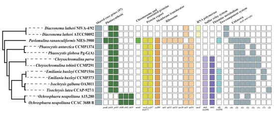 The majority of the genes in the haptophyte plastid genomes was conserved, but some differences in gene content were observed (Figure 5 and Supplementary Table S3). For example, 97 genes involved with photosynthesis, DNA synthesis, DNA repair, protein export, and sulfur-related genes were well conserved in the haptophyte plastid gene inventories. Three LIPOR genes of chlB, chlL, and chlN were only present in the two O. neapolitana plastids, whereas the psaK and psbX genes were absent in Ochrosphaera. The secG and ycf47, protein-export-related genes, and membrane translocator ycf80 gene, were absent in two Pavlovales strains. The thiS and thiG genes were absent in species of Pavlovales, Pavlomulinales, and Phaeocystales. No horizontal gene transfer (HGT) candidates were found in the plastid genome except for rpl34 gene, which is a well-known bacterial gene transfer case to the ancestor of the haptophyte and cryptophyte plastid genomes [].