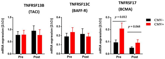 Comparison of the transcript levels of TNFRSF13C (BAFF-R), TNFRSF13B (TACI), and TNFRSF17 (BCMA) in peripheral blood from recipients of the CMV− group (n = 18) and recipients of the CMV+ group (n = 12). The amounts of mRNA were reported to the CD19 gene. The expression of the BAFF and APRIL genes was normalized using the HPRT gene as an endogenous reference, while the expression of the TNFRSF13C (BAFF-R), TNFRSF13B (TACI), and TNFRSF17 (BCMA) genes was normalized using the CD19 gene. Expression data are represented as the mean ± SEM. As previously published, statistical analyses were performed using the Wilcoxon test for related samples [2]. Values of p < 0.05 were considered significant.