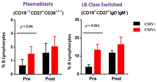 In this particular analysis, kidney graft recipients suffering post-transplant CMV reactivation tended to have higher plasmablasts (CD19−/+CD27+CD38**) and lymphocyte B class-switched (CD19+CD27+IgD−IgM−) numbers and percentages pre transplantation that were statistically borderline (p = 0.06 and p = 0.061, respectively) but not statistically significant (p > 0.05) (Figure 3).