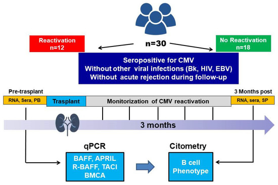Briefly, a prospective longitudinal study was conducted on the gene expression of molecules in the BAFF system. This was carried out using KTR samples collected before KT, and at three and six months after surgery (all the post-transplantation tests were strictly performed simultaneously to avoid eventual differences in other particular conditions and immunological status) (Figure 4). We used qPCR technique to measure the gene expression of the molecules in the BAFF system (BAFF, APRIL, R-BAFF, TACI, and BCMA). The results of the experimental study were used to establish a relationship between B cell subtypes, CMV reactivation, and BAFF system molecule transcript levels. A detailed study design, workflow, and sequential steps of the performed work are shown in Figure 4.