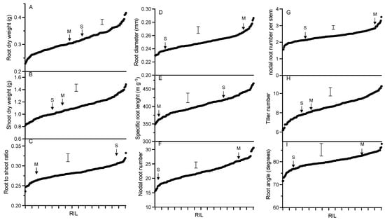 Distribution profiles of various traits across RILs. BLUP data with SE as error bars and locations of parental lines are shown (M = Maringa and S = Spica).