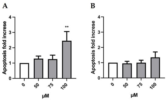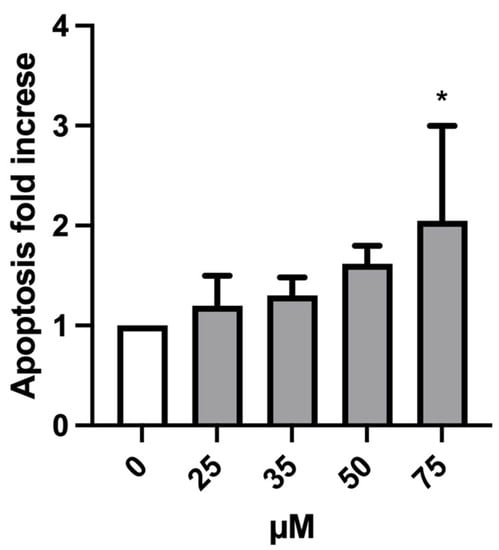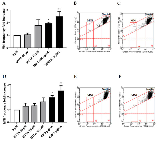 In order to identify the MTTA concentrations to be tested for the MNi frequency analysis, the apoptotic process was also evaluated as one of the cell death mechanism alternatives to necrosis. In particular, the concentrations tested were able to induce a two-fold increase in apoptosis compared to those registered in negative controls. Starting from the cytotoxicity and cytostasis analyses, aliquots of 2.5 × 105 TK6 cells were treated with the selected MTTA concentrations 0, 50, 75 and 100 μM for the short-term time (3 h) and with MTTA 0, 25, 35, 50 and 75 μM for the long-term time (26 h).