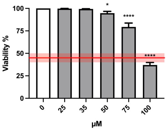 In order to assess cytotoxicity, aliquots of 2.5 × 105 TK6 cells were seeded and treated with MTTA 0, 50, 75 and 100 μM for 3 h with and without S9 mix, followed by 23 h of recovery, or with MTTA 0, 25, 35, 50, 75 and 100 μM for 26 h without S9 mix. After treatments, cytotoxicity was assessed by considering the viability percentage. In more detail, cells were stained with PI dye. The viability was automatically calculated considering 1000 events (cells) by the Guava software guavaSoft™ 2.7 (Merck, Darmstadt, Germany). For each treatment concentration, the percentage of viability was recorded and normalized to the concurrent negative control set at 100%.