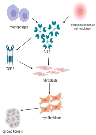 Gal-3 has been regarded as a key effector in the promotion of fibrosis after the initial disproportionate inflammation-driven processes, which will enhance the transformation of fibroblasts into myofibroblasts and, therefore, the expansion of the ECM, a mandatory stage in fibrotic tissue genesis [6]. This mechanism is mediated by transforming growth factor-beta (TGF-β) and macrophages, which both promote myofibroblast differentiation [17,18]. It has been known for a long time that Gal-3 is overexpressed within macrophages, as proven by early experimental studies [19]. Moreover, Gal-3 stimulates TGF-β activity and has been proposed as a therapeutic target in the mediation of idiopathic pulmonary fibrosis [20]. Excessive macrophage aggregation and inducement of the TGF-β1/α-smooth muscle actin (SMA)/collagen I (Col I) profibrotic pathway represents essential physiopathological processes leading to atrial fibrosis, according to experimental studies conducted on rats [21,22,23]. The involvement of Gal-3 in the pathogenesis of cardiac fibrosis is briefly illustrated in Figure 1.