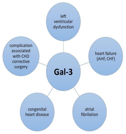 Starting from evidence based on the active role of Gal-3 in the modulation of cardiac fibrosis, multiple research articles have proposed this molecule as a biomarker for various cardiovascular diseases, including cardiac insufficiency, atrial fibrillation and congenital cardiac malformations, or as a predictor of long-term outcomes after cardiac resynchronization therapy [27,28,29,30,31]. As most chronic heart disease conditions will eventually lead to the development of chronic heart failure (CHF), the role of Gal-3 as a prognostic factor and mortality predictor in patients diagnosed with severe myocardial disfunction has been thoroughly investigated [32,33,34]. Figure 2 provides a synopsis of the associations between Gal-3 and various cardiovascular disorders.