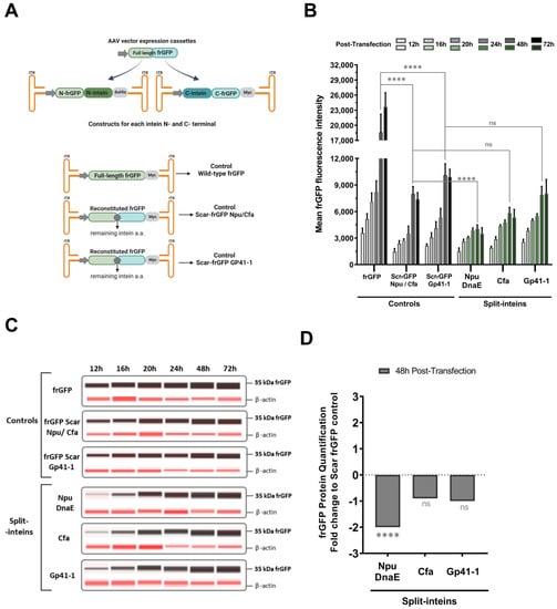 Studies were conducted to evaluate the performances of split-inteins Cfa and Gp41-1 compared to that of the Npu DnaE. In all three of them, AAV vector expression cassettes were developed with a split folding reporter GFP (frGFP) [,] gene fused to the respective terminal of each split-intein (Figure 1A).