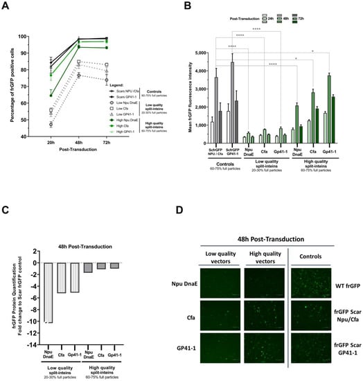 Impact of vector quality on split-inteins’ performances. Lower-quality preparations presented an average of 20–30% of full particles and higher-quality preparations presented an average of 60–75% of full particles. Lower- and higher-quality AAV2 vector split-intein preparations were used to co-transduce HT1080 cells with a vector dose of 5 × 104 V.G./cell for each vector. The frGFP protein reconstitution evaluation was performed by flow cytometry at three different time points post-transduction. (A) The percentage of cells with reconstituted frGFP. The difference of 10–15% less transduced positive cells with lower-quality AAV2 vector preparations represents a significance of ****. (B) The reconstituted frGFP fluorescence intensity values, shown as the mean of frGFP intensity. Capillary Western blot analysis of frGFP protein reconstitution levels was performed for all time points (shown in Figure S6). Cell extracts were analyzed by immunoblotting with an anti-Myc-tag antibody. Full-length or reconstituted frGFP is shown as a 35 kDa protein. (C) Quantification of split-inteins frGFP protein reconstitution. Values are shown as fold-change relative to the mean of frGFP protein quantified in the controls at 48 h post-transduction. (D) Fluorescence images of frGFP protein expression upon transduction at 48 h (scale bar = 200 μm). frGFP: folding reporter GFP. ScfrGFP: scar frGFP. Flow cytometry data represent the mean ± SD; n = 3; * p ± 0.046, **** p < 0.0001 by Tukey’s post hoc multiple comparison test.