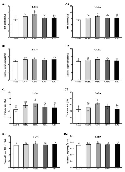 2.2. Effects of L-Cys and GABA Treatments on TSS, SS, TA, and Vitamin C Content