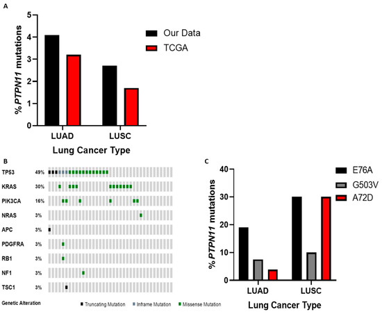 PTPN11 mutation occurrence and co-occurrence alongside other mutations in both lung adenocarcinomas and squamous cell carcinomas. PTPN11 mutation occurrence rate across the genotyped tumour tissue of NSCLC patients (n = 356) and TCGA data (n = 586) (A). Oncoprint shows the gene alterations in each individual with PTPN11-mutated NSCLC (n = 37), focusing on known cancer-related genes. Each box represents a patient; genes and corresponding alteration frequencies are listed (B). The type of PTPN11 mutation occurring across both adenocarcinomas (LUAD) and squamous cell carcinoma cohorts (LUSC) is displayed (n = 37) (C).