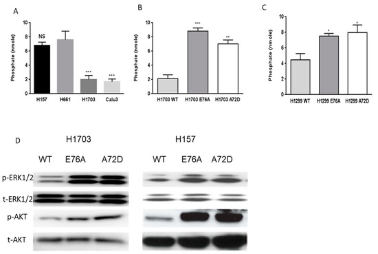 To further confirm the oncogenic activity of NSCLC somatic PTPN11 mutations, we transduced E76A, A72D, WT PTPN11, and an empty vector in NCI-H1703 and NCI-H1299 NSCLC cells. As expected, we observed greater Shp2-phosphatase activity in NCI-H1299 and NCI-H1703 transduced with NSCLC PTPN11 mutations compared to those transduced with wild type PTPN11 (Figure 3B,C).