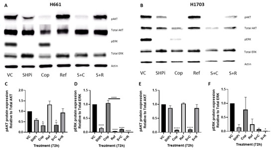Having shown that cellular viability appeared to be sensitized to PI3K and MAPK targeting in combination with Shp2 inhibition, we next sought to investigate whether dual treatment impacted the downstream pathway members via Western blotting. Both H661 and H1703 cells were treated with SHPi (10 µM), copanlisib (200 nM), and refametinib (10 µM) for 72 h, following which the proteins were extracted, quantified, and imaged via Western blotting for phosphorylated AKT (pAKT) and phosphorylated ERK1/2 (pERK) before being densitometrically analysed (relative to Actin and Total AKT/ERK). Although there were significant decreases in PTPN11-WT NCI-H1703 cell pAKT following copanlisib treatment and pERK following refametinib treatment, these differences were not significantly altered by the combination settings (Figure 6). However, in PTPN11-mutated NCI-H661 cells, there was a demonstrated increase in pERK following copanlisib treatment, suggesting the activation of the MAPK pathway, but this was significantly attenuated in the presence of SHPi when in combination with copanlisib (p ≤ 0.0001) (Figure 6). Thus, we can suggest that SHPi treatment in combination with PI3K pathway targeting agents might prevent the positive feedback activation of downstream MAPK pathway members.
