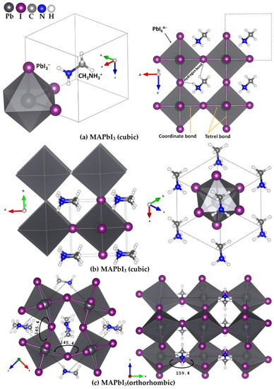 The unit cell (left) and 2 × 2 supercell (right) structure of cubic MAPbI3 in the high-temperature phase (T > 330 K [95]), showing the orientation of the organic cation along the (a) (111) and (b) (011) directions [25]. (c) Two different polyhedral views of the low-temperature orthorhombic phase of fully relaxed (PBEsol) geometry of MAPbI3, with the titling angle (in degrees), ∠Pb–I–Pb, along two crystallographic directions (see ESI for details), obtained using the VASP code (version 5.4) [96,97,98,99,100]. Each polyhedron represents the PbI64− octahedron. Three types of bonds (coordinate, tetrel and hydrogen bonds) are marked in the polyhedral model in (a).