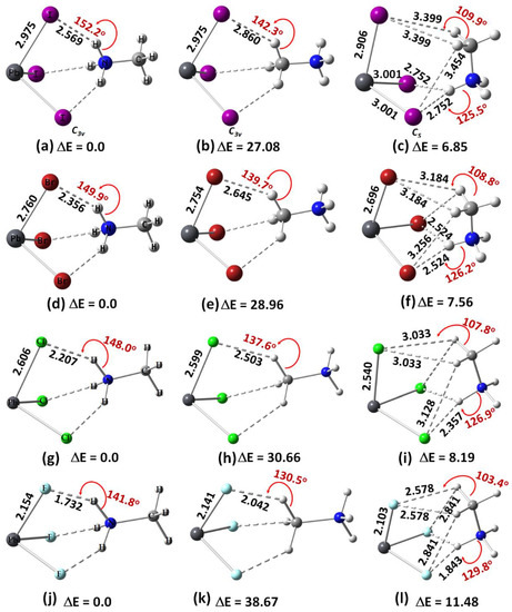 The molecular graphs of all twelve ion pairs associated with the three conformers [PbX3−···NH3CH3+], [PbX3−···CH3NH3+] and [PbX3−···H3NCH3+] (X = I, Br, Cl, F) are shown in Figure 4. The N–H···X hydrogen bonds in Conf. 1 and Conf. 3 are shown in the ion pairs (Figure 4a,c,d,f,g,i,j,l) as dotted bond paths between the bonded atomic basins with a (3, –1) bond critical point (bcp) between them [78]. The C–H···X hydrogen bonds are present in Conf. 2 in which the methyl H atoms point towards the triangular X3 face of the inorganic anion. They are weaker than the N–H···X hydrogen bonds, indicated by the charge density values, ρb, at their corresponding bcps.