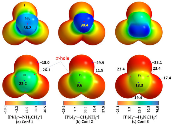 [ωB97X-D/def2-TZVPPD] level potential on the electrostatic surface of the three conformations of [CH3NH3+•PbI3−]: (a) [PbI3−···NH3CH3+]; (b) [PbI3−···CH3NH3+]; and (c) [PbI3−···H3NCH3+]. The methyl, ammonium and both groups of MA are facing the reader in the top panel of (a), (b) and (c), respectively. The Pb atom is facing the reader in the bottom panel of all three MESP plots shown in (a–c). Values on the color bar are in kcal mol−1. Atom labeling is shown for selected systems.
