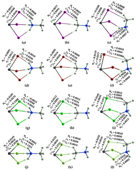 [ωB97X-D/def2-TZVPPD] level QTAIM’s molecular graphs for [CH3NH3+•PbX3−] (X = F, Cl, Br, I) ion pairs in the conformational space, including (a) [I3Pb···NH3CH3]; (b) [I3Pb···CH3NH3]; (c) [I3Pb···H3NCH3]; (d) [Br3Pb···NH3CH3]; (e) [Br3Pb···CH3NH3]; (f) [Br3Pb···H3NCH3]; (g) [Cl3Pb···NH3CH3]; (h) [Cl3Pb···CH3NH3]; (i) [Cl3Pb···H3NCH3]; (j) [F3Pb···NH3CH3]; (k) [F3Pb···CH3NH3]; (l) [F3Pb···H3NCH3]. The bond paths are shown as solid and dotted lines, respectively, in atom colors, and bond critical points (bcps) as tiny spheres in green between bonded atomic basins. Values (in a.u.) represent the charge density (ρb), the Laplacian of the charge density (∇2ρb) and the total energy density (Hb) at bcps. Atom labeling is shown for each case.