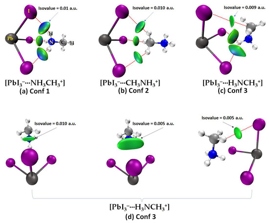 That QTAIM missed the C–H···X hydrogen bonds in Conf. 3 is confirmed by our IGM-δginter analysis, presented in Figure 5. The results demonstrate that the IGM-δginter isosurface volumes (circular or flat), colored bluish green (or green), spread within the area between the interacting atomic basins that are non-covalently engaged with each other, a color code that appears only when there is an attractive interaction between the interacting basins. These isosurfaces are representatives of ρ × sign (λ2) < 0, where λ2 is the second eigenvalue of the Hessian of the charge density matrix. When ρ × sign (λ2) > 0, one would expect repulsion between interacting basins, and these are generally described by red isosurfaces. Van der Waals interactions correspond to ρ × sign (λ2) ≈ 0 [93,94]. Clearly, as inferred from geometries alone (see Figure 2, for example), Conf. 1 and Conf. 2 are stabilized by N–H···I and C–H···I hydrogen bonds, respectively, with the former relatively stronger than the latter. Similarly, Conf. 3 is stabilized by N–H···I, C···I and C–H···I close contacts. The latter are very weak and appear only when an isovalue < 0.01 a.u. is used. The flat capsule type isosurface volume between the methyl group in MA and I in the inorganic anion in Figure 5d suggests that the attraction between the interacting units is weakly dispersive and includes weak C–H···I hydrogen bonds and the C···I tetrel bond. The presence of the former was confirmed when the interacting atomic basins (H and I) in the ion pair were used in the analysis of IGM-δginter for which a smaller isovalue of 0.005 a.u. was invoked. This is shown in Figure 5d (right), and the IGM-δginter isosurface volume between I and H representing C–H···I is more localized and weaker. These conclusions may hold for ion pairs formed with any other halogen derivative.