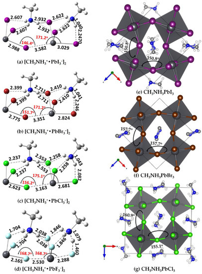 [ωB97X-D/def2-TZVPPD] level fully relaxed gas phase geometries of (a) [CH3NH3+•PbI3−]2; (b) [CH3NH3+•PbBr3−]2; (c) [CH3NH3+•PbCl3−]2; and (d) [CH3NH3+•PbF3−]2. Shown in (d–f) are the low-temperature orthorhombic structures of MAPbI3, MAPbBr3 and MAPbCl3. Selected bond lengths (Å) and bond angles (degrees) are shown in (a–d), and the tilting angle (degrees) is shown in (e–g). The H atoms in MA are missing in the crystal structure of MAPbBr3.