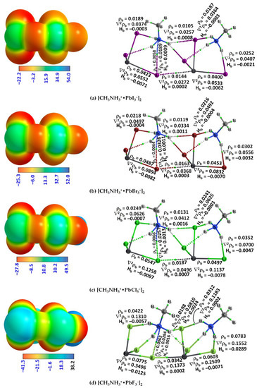 A question that arises is why the [PbI3−] anions are bonded to each other in the crystal, forming an infinite array of [PbX64−]∞ octahedra that form cage-like structures to host the organic cations, even though the anions are expected to coulombically repel each other. An immediate answer to this is probably the presence of CH3NH3+ that locally polarizes the potential on the electrostatic surface of the tetrel atom in [PbI3−] when in close proximity, driven by an extensive number of double-charge-assisted N–H···X and C–H···X hydrogen bonds that appear between them. As the surface of the tetrel atom in the ion pair [CH3NH3+•TtX3−] is highly electrophilic, featuring three positive σ-holes on Tt (Tt = Pb and Sn), it is capable of accepting electrons simultaneously from three halogens of three interacting ion pairs [CH3NH3+•TtI3−] at equilibrium, forming the [TtX64−] octahedra in the crystalline phase. QTAIM calculations suggest there is an appreciable transfer of charge between the organic and inorganic ions, facilitating the formation of the ion pair, and this is true in all three conformations investigated for [CH3NH3+•TtX3−], a feature that also occurs between the ion pairs responsible for the dimers. When the same process of assembly continues with [CH3NH3+•PbX3−] ion pairs, the formation of CH3NH3TtX3 perovskite in the solid state is the likely consequence, a result of interplay between the σ-hole-centered tetrel bonds and other non-covalent interactions. The MESP plots that provide evidence of the formation of X–Tt···X tetrel bonds (dotted lines) between two ion pairs, leading to the formation of [CH3NH3+•PbX3−]2 dimers, are shown in Figure 7a–d (left). They show that the positive σ-hole on Pb in an ion pair is in coulombic attraction with the negative halide of the anion with which it interacts.