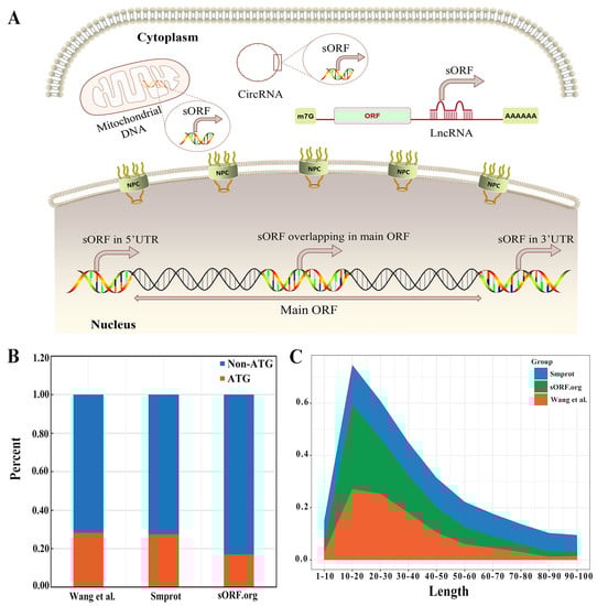According to the ENCODE database, about 2–3% of the human genome is composed of protein-coding genes, and more than 80% are viewed as ncRNAs [1,2]. With the advanced development of high-throughput sequencing technology, more and more diverse ncRNAs have been discovered to be involved in numerous essential biological processes, such as genomic regulation [3], environmental responses [4], and body development [5]. Generally, ncRNAs are classified into long non-coding RNAs (lncRNAs), small RNAs (miRNAs), piwi-interacting RNAs (piRNAs), circular RNAs (cirRNAs) and others. They were initially considered “transcriptional noise” [6,7]. However, research has reversed the view that ncRNAs represent “junk” transcription products [8]. One or more short open reading frames (sORFs), which rarely use AUG as the start codon, may be present in these ncRNAs. The majority are initiated by near-homologous codons (meaning codons that differ from AUGs by one nucleotide), such as CUG, GUG, UUG, and ACG [9]. These sORFs may encode small proteins with less than 100 amino acids, and various professional terms have been used to describe these proteins, such as micropeptides, small peptides, microproteins, sORF-encoded peptides (SEPs), etc.