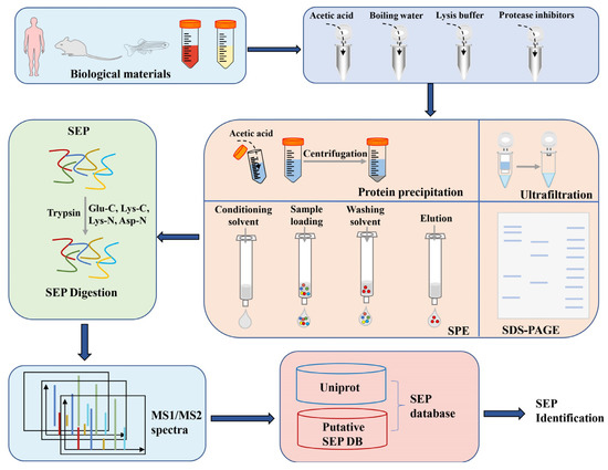 The first critical step for SEP identification is extracting SEPs from complex biological matrices while ensuring their integrity (Figure 3). SEPs with a small size and a low molecular weight are difficult for peptidases to hydrolyze, and they may not have any sites for protease digestion or may be covered by undesired protein degradation products [65]. SEP extraction is, therefore, more challenging than that of proteins. Previous studies have tried various methods to ensure the integrity of SEPs, such as heating samples in boiling water or lysis buffers, using an ultrasonic treatment, or adding protease inhibitors to inhibit peptidase and protease activity [66,67]. However, some polypeptides, such as peptidases or protease inhibitors, can interfere with the subsequent analysis of SEPs. Therefore, some studies have proposed alternative methods, such as inducing protein precipitation with hydrochloric acid or acetic acid, which not only effectively prevent the degradation of SEPs, but also do not interact with polypeptide enzymes [67]. Therefore, the treatment of biological samples is a key step in extracting SEPs. The stability of biological samples and the objectives of the research should guide the selection of the appropriate extraction techniques.