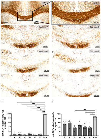Cuprizone-induced demyelination analyzed by the optical density of the anti-PLP labelling. (A–H) Representative images of the anti-PLP immunolabelling of the medial corpus callosum in region 265 in control animals (A), magnified in (B), and in animals intoxicated with six different Cuprizone formulations for five weeks (C–H). (I) Quantification of the optical density of the anti-PLP immunolabelling for region 265 in the medial corpus callosum samples. Statistical testing was performed using ordinary one-way ANOVA with Tukey’s multiple comparisons test. (J) Quantification of the optical density of the anti-PLP immunolabelling for region 215 in the lateral corpus callosum samples. Statistical testing was performed using Kruskal–Wallis test with Dunn’s multiple comparisons test. * p ≤ 0.05, ** p ≤ 0.01, *** p ≤ 0.001.