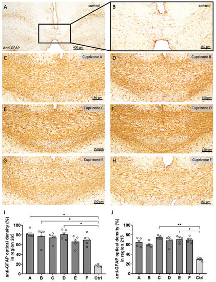 Cuprizone-induced astrogliosis analyzed by the optical density of the anti-GFAP labelling. (A–H) Representative images of anti-GFAP immunolabelling of the medial corpus in region 265 in the control animals (A), magnification in (B) and in the animals intoxicated with six different Cuprizone formulations for five weeks (C–H). (I) Quantification of the optical density of the anti-GFAP immunolabelling for region 265 in the medial corpus callosum. Statistical testing was completing using Kruskal–Wallis tests with Dunn’s multiple comparisons tests. (J) Quantification of the optical density of the anti-GFAP immunolabelling for region 215 in the lateral corpus callosum samples. Statistical testing was completed using Kruskal–Wallis tests with Dunn’s multiple comparisons tests. * p ≤ 0.05, ** p ≤ 0.01.