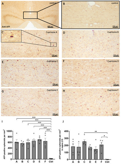 - Goldberg, J.; Clarner, T.; Beyer, C.; Kipp, M. Anatomical Distribution of Cuprizone-Induced Lesions in C57BL6 Mice. J. Mol. Neurosci. 2015, 57, 166–175. [Google Scholar] [CrossRef]