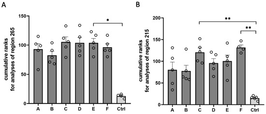 Evaluation of the efficacy of the different Cuprizone formulations by cumulative analysis of all measured parameters. (A,B) Cumulative ranks for all analyses performed in this study for region 265 (A) and region 215 (B) for the control animals and for the animals intoxicated with the six different Cuprizone formulations. Statistical testing was performed using Kruskal–Wallis test with Dunn’s multiple comparisons test. * p ≤ 0.05, ** p ≤ 0.01.