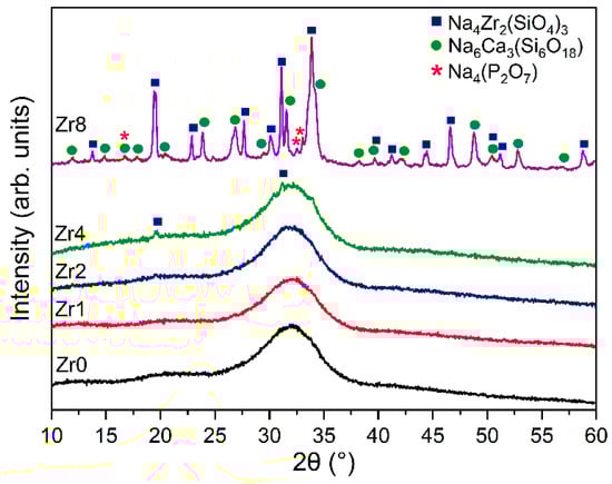 The XRD patterns of the Bioglass samples modified by the insertion of ZrO2 are shown in Figure 1. The 45S5 Bioglass sample, Zr0, did not reveal any sharp or discrete diffraction peaks but instead shows broad bands characteristic of amorphous materials [11,15,25]. The insertion of a small quantity of ZrO2 (less than 2 mol%) into the glass network did not change the amorphous characteristics of the 45S5 Bioglass. However, by increasing the concentration of ZrO2, new crystalline phases were observed. This behavior has already occurred in Bioglass containing zirconium [23]. For the Bioglass containing 8 mol% of ZrO2, crystalline phases were identified, such as sodium zirconium silicate (Na4Zr2(SiO4)3) with a hexagonal crystalline structure, sodium calcium silicon oxide (Na6Ca3(Si6O18)) with a hexagonal crystal system, and sodium phosphate (Na4(P2O7)) that exhibits an orthorhombic structure. Moreover, the XRD pattern of the Bioglass modified with the insertion of 4 mol% of ZrO2 shows the presence of (Na4Zr2(SiO4)3). From the XRD patterns, it is possible to conclude that adding a high amount of ZrO2 to the 45S5 Bioglass leads to the formation of crystal phases. As a result of this crystal formation, the glass is no longer in the glass-forming region of this system.