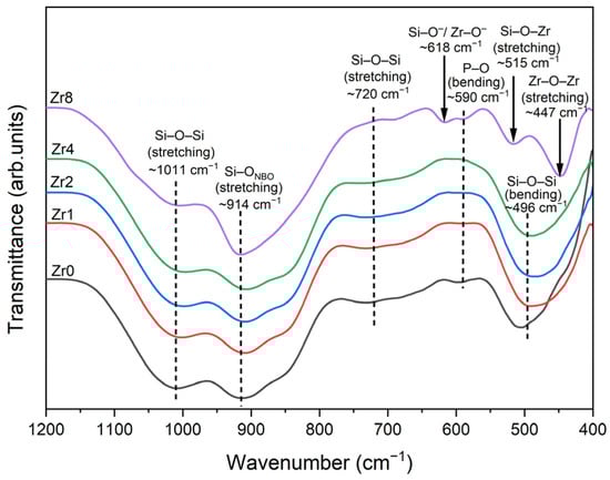 In Figure 2, the FTIR spectra of the glasses illustrate various features. The bands detected at approximately 1011 cm−1 and 720 cm−1 are linked to the Si–O–Si stretching modes. A band at 914 cm−1 was observed and attributed to the Si–ONBO stretching mode, indicating the presence of non-bridging oxygen (NBO) ions. A noticeable intensification of this band was observed for the Zr8 sample as compared to the spectra of the other glass samples, thus indicating an increase in the number of NBO ions linked to silicon Si atoms within the glass network. This increase in NBO concentration is likely attributed to the formation of the Na6Ca3(Si6O18) crystal phase as shown in the XRD analysis. Additionally, a shoulder observed at 590 cm−1 is associated with the bending vibration of the P–O molecule. The Si–O–Si bending mode is linked to the band appearing at around 496 cm−1 [15,26,27,28,29,30,31].