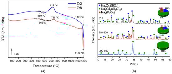 Moreover, the exothermic peak associated with the formation of crystalline phases is larger and shifted to a higher temperature for the sample Zr2 compared to the Zr8 sample. To examine this change in the exothermic peak, an XRD analysis was performed on the Zr2 and Zr8 samples thermally treated at 800 °C for 6 h (designated as Zr2-800 and Zr8-800). According to the XRD results presented in Figure 3b, the exothermic peak observed for the Zr2 sample is attributed to the formation of the Na6Ca3(Si6O18) phase. The decrease in the crystallization peak for the Zr8 sample is related to the growth of the Na6Ca3(Si6O18) phase as a result of the relative decrease in Na4Zr2(SiO4)3 and Na4(P2O7) phases.